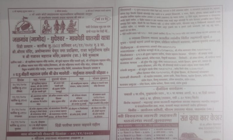 रामदास स्वामी संप्रदायातील सद्गुरु श्री ब्रह्मचैतन्य रामानंद प्रल्हाद महाराज यांचे पट शिष्य, श्री हरी महाराज श्रीक्षेत्र माकोडी तालुका मोताळा यांचा चातुर्मास समाप्ती सोहळा कार्तिक शुद्ध बारस दि.13/11/24 बुधवारी आयोजित केला असून, त्यानिमित्त जळगांव जामोद येथून पालखी यात्रेचे आयोजन केलेले आहे. श्रीराम मंदिर अयोध्या नगर येथून दि. 9/11/24 ला शनिवारी संध्या.4 वाजता नगर परिक्रमे करिता पालखी प्रस्थान होईल. धनगर पुरा, चौभारा मेन रोड, ओंकारेश्वर मंदिर, सिनेमा रोड, दुर्गा चौक, राजा भर्तृहरीनाथ मंदिर मार्गाने श्री गजानन महाराज मंदिर योगीराज नगर येथे पालखी मुक्काम आहे. रविवारी दि.10/11/24 ला महासिद्ध महाराज मंदिर श्री क्षेत्र धानोरा, श्री सुपो महाराज मंदिर पळशी सुपो, श्री मच्छिंद्रनाथ महाराज मंदिर वडोदा यांचे दर्शन घेऊन.. श्री अंबिका व भवानी माता मंदिर सिनफाटा येथे पालखी मुक्काम राहील. दि. 11/11/24 ला सोमवारी तालखेड, भोटा मार्गे छोटा हनुमान मंदिर पिंपराळा, श्रीधुपेश्वराचे दर्शन घेऊन..श्री विठ्ठल रुक्मिणी मंदिर पान्हेरा येथे पालखी मुक्कामी राहील. दी. 12/11/24 ला मंगळवारी घिर्णी बेलाड येथे, श्री गजानन महाराजांचे दर्शन घेऊन..श्री सात बळेश्वर शिवमंदिर दाताळा येथे पालखी पोहचेल. श्री चैतन्य राम मंदिर श्रीक्षेत्र माकोडी येथे पालखी मुक्काम राहील. दि.13/11/24 ला बुधवारी होम हवन श्रीहरी महाराज दर्शन व प्रवचन भजन कीर्तन हरीहट कार्यक्रमात भाविक सहभागी होऊन महाप्रसादानंतर पालखी वाहनाने जळगांवला परत येईल.