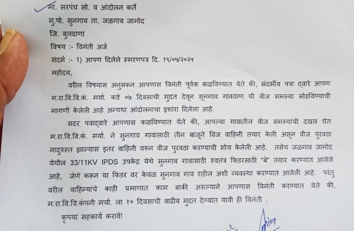 बुलढाणा जिल्ह्यात, जळगांव जामोद, तालुक्यातील सुनगाव येथील गावकऱ्यांनी एकत्रित येत दिनांक १९ मे रोजी तहसीलदार जळगाव जामोद व महावितरण अभियंता चौभारेवाला यांना गावाचा विज पुरवठा नेहमी खंडित होत असून विज पुरवठा सुरळीत करा याबाबत स्मरणपत्र देण्यात आले.महावितरण विभागाला मागील वर्षी १९ जून २०२४ ला गावकऱ्यांनी याच विजेच्या समस्येबाबत निवेदन दिले होते..